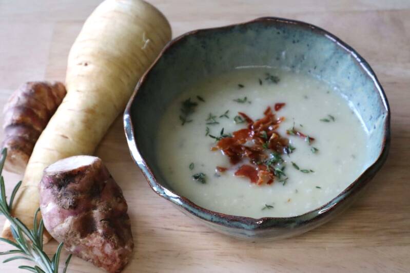 Geniet van een smaakvolle aardpeer-pastinaaksoep, een perfecte balans tussen zoet en hartig. Ideaal als verwarmend voorgerecht of maaltijd.